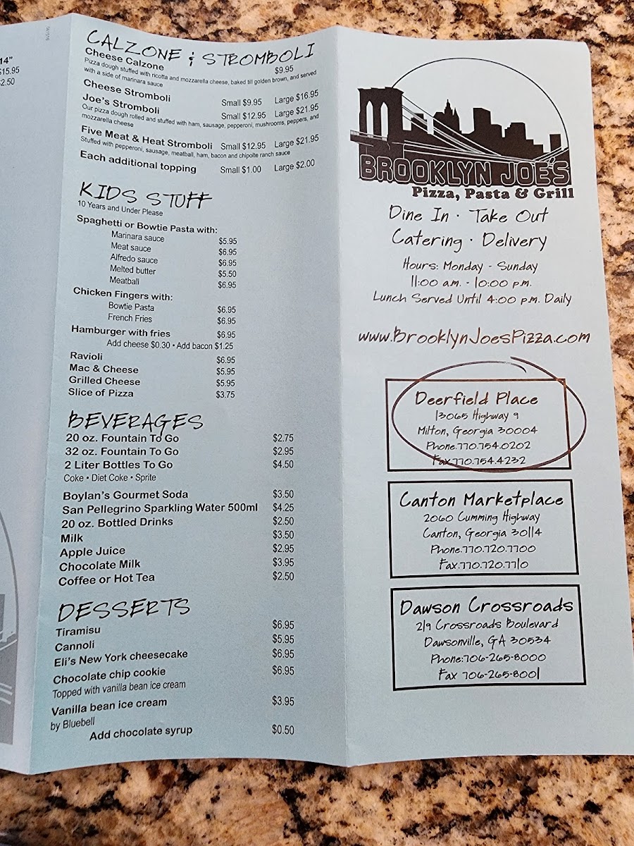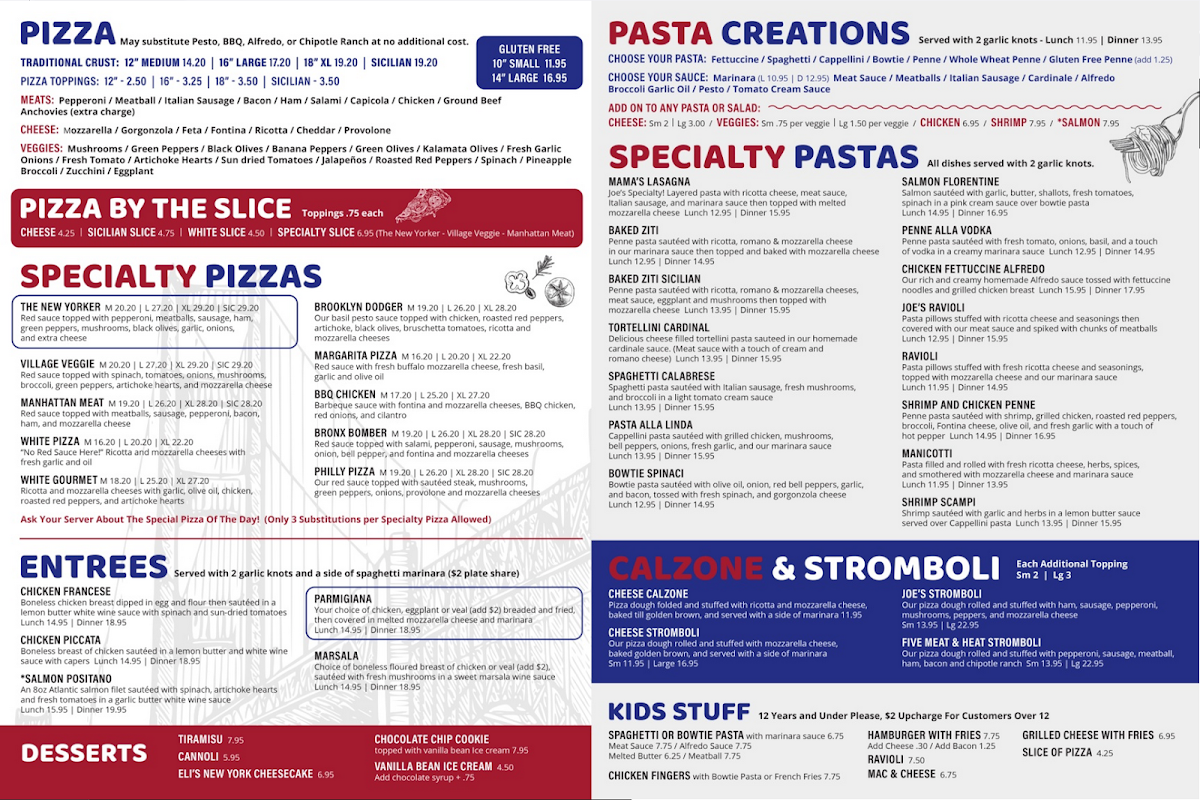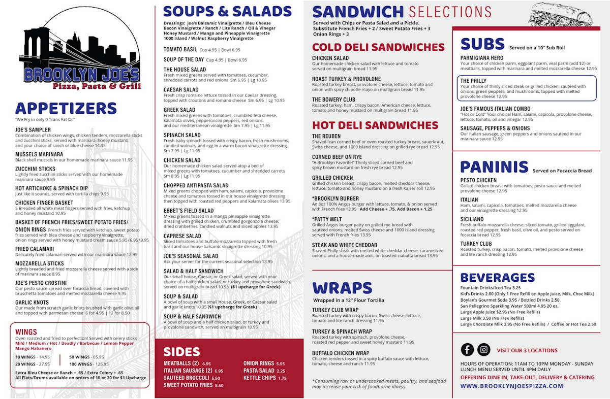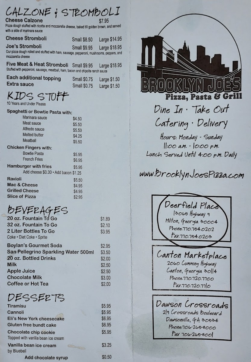 Brooklyn Joe's Pizza Pasta offers a straightforward and inviting menu that draws from classic Italian and New York-style pizzeria traditions. The selection includes casual bites perfect for family dinners, relaxed nights out with friends, or a comforting solo meal after a busy day. From crispy garlic knots and mozzarella sticks to hearty slices of traditional New Yorker pizza, the menu balances familiar favorites with thoughtful Italian touches.